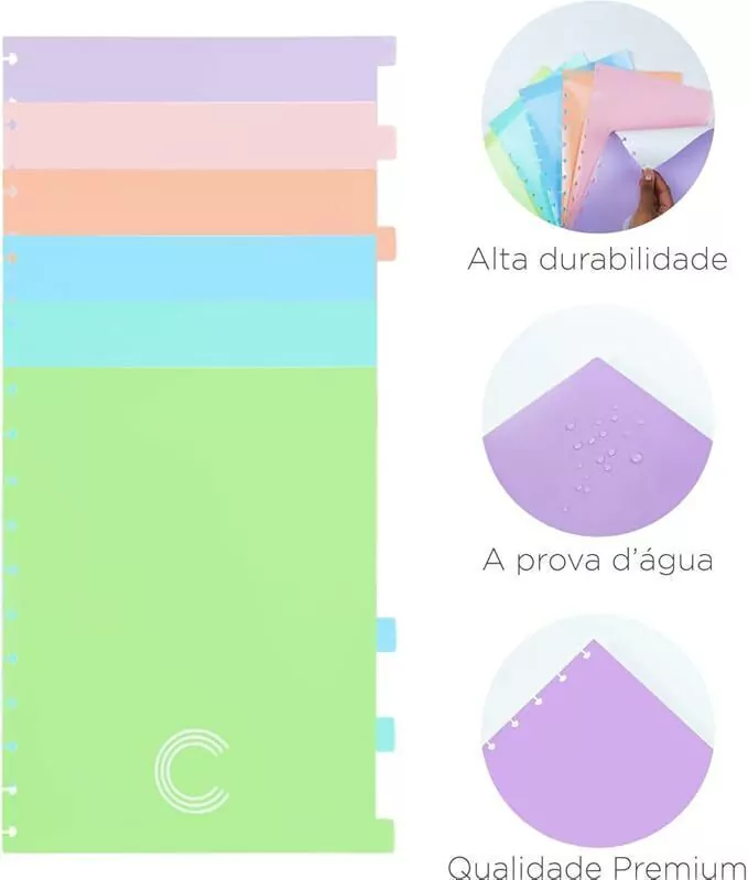 Com suas divisórias coloridas, você pode separar suas matérias de forma prática e visualmente atraente. Cada seção é projetada para facilitar o acesso rápido às suas anotações, tornando o aprendizado mais dinâmico e divertido.